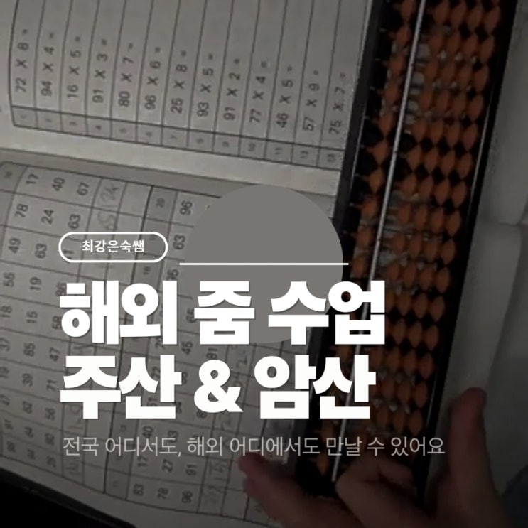 반도 8차 주산교습소 최강은숙쌤입니다. 매주 주1회 수업으로 1년에 1급까지 줄줄~ 주판으로 놓는 아이? 가능할까요? 줌이라서 별로라고 생각하실 수 있으실텐데요... 해외에는 사교육도 없고, 학원도 안다니고.. 시간이 많잖아요~ 한국과는 다르게 여가 시간이 많다고 합니다. 해외 아이들은 참 행복 할 것 같아요. 그래서... 저와 더 잘 맞는 아이가 있었던것 같아요. 만나서 반가운, 가르치는 보람을 느끼게 하는 아이가 있답니다. 하도 시간이 된다고 하셔서... 3급 5장 풀다가 10장으로 늘리고 ... 걱정했었던 마음은 뒤로하고... 3급 10장 + 1급 주산10장 일주일 20장 하고 있습니다.. 대면으로 만난적 한번 없지만, 누구보다 열심히 풀....... <img src="https://blogthumb.pstatic.net/MjAyNjAxMzBfODIg/MDAxNzY5NzQ4ODE1OTQ2.Z1Tn3Deio-k4f7jABAZorJ6VjudJXklSMlBqqV1kSwkg.-_98auynlXgwce2_gJ23gBqpqyvxQSsFkJxrsluRJfYg.JPEG/900%A3%DF%C8%F2%BB%F6%B0%FA_%B0%CB%C1%A4%BB%F6_%B1%F2%B2%FB%C7%D1_%BB%E7%C1%F8%B9%E8%B0%E6_SNS_%BA%ED%B7%CE%B1%D7_%C4%AB%B5%E5%B4%BA%BD%BA_%C5%B8%C0%CC%C6%B2_%C6%F7%BD%BA%C6%AE_%BD%E6%B3%D7%C0%CF_%C0%CE%BD%BA%C5%B8%B1%D7%B7%A5_%B0%D4%BD%C3%B9%B0%A3%DF20260130%A3%DF135325%A3%DF0000.jpg?type=s3" />