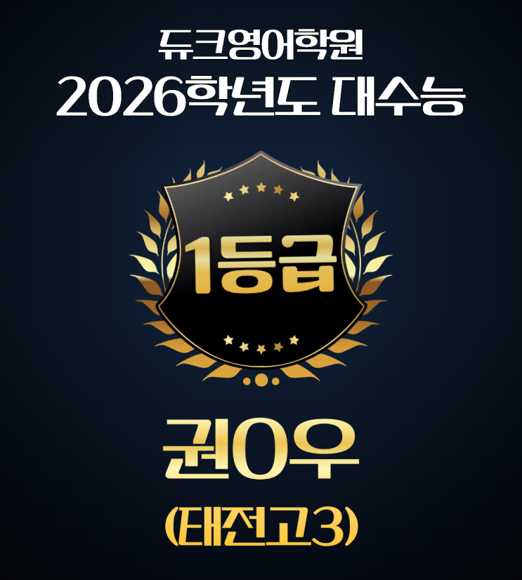 안녕하세요, 태전동 영어학원 듀크영어학원입니다. 지난 2025년 11월 13일 시행된 2026학년도 대수능에서 1등급을 획득한 듀크 학생을 소개합니다! 본 원생의 경우, 초등학교 5학년 겨울방학부터 고3 1학기까지 빠짐없이 듀크에 다녔습니다. 이 학생은 코로나 시기 온라인 줌 수업에도 모두 참여하는 등 내신수업과 정규 수업 모두 빠짐없이 성실히 학원 수업에 참여했습니다. 내신 대비 때에도 학원에서 배부한 워크북과 문제집을 모두 풀 정도로 성실하고 열의가 높은 학생이었고, 그 결과 태전고 영어 내신에서 항상 1등급을 받았을 뿐만 아니라 수능에서도 1등급이라는 좋은 성적을 거....... <img src="https://blogthumb.pstatic.net/MjAyNTExMjFfMTY1/MDAxNzYzNzE2NjU5Mjk0.nNf-0fzJLh4K9WpDHlXbKP5fz2p5KYZA0T613__w2v8g.RuZoZVesuoQiXLnxwkEHVVh8ynZoHWQ1sP6BEEI1LB0g.PNG/%BC%F6%B4%C91%B5%EE%B1%DE.png?type=s3" />