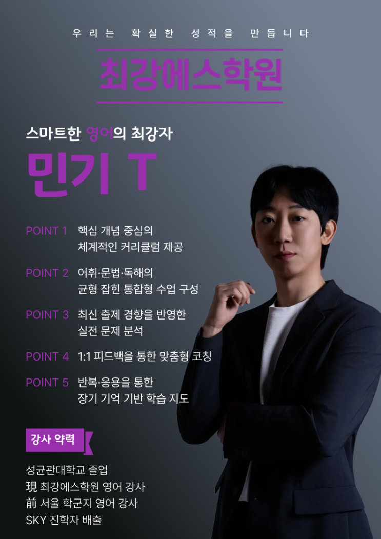 안녕하세요, 최강에스학원의 영어 강사 민기T입니다! 우리는 확실한 성적을 만듭니다. 서울 유명 학군지에 위치한 학원을 거쳐, 현재 최강에스학원의 영어 강사로 재직중인 민기 T는 다수의 SKY 진학자를 배출하며 확실한 결과를 만들어냈습니다. 기초가 필요한 학생부터 '1등급 학생'까지 각 학생의 학업 수준과 목표는 다를 수밖에 없습니다. 민기T는 성적 분석과 진단으로 학생 개개인의 한계를 정확히 파악하고, 학업 수준에 맞춘 쉽고 명확한 설명으로 수업을 진행합니다. - 1등급 학생 : 실수 없는 완성형으로, 고정 1등급 유지 - 2등급 학생 : 출제 패턴 분석 + 반복 훈련을 통한 1등급 상승 설계 - 내신 & 수능 이원화 전....... <img src="https://blogthumb.pstatic.net/MjAyNTExMjFfMjQx/MDAxNzYzNzIxNzA2MzE4.bbXEBh_xN63ASBtyScXbd4ecZMODMFpMGZODgQDJYrEg.3WxPKkDwxTbeCUAOyPNdyKkWl-gId2RwaO_C4CdviWQg.PNG/2025_%C6%F7%BD%BA%C5%CD_%B9%CE%B1%E2T.png?type=s3" />