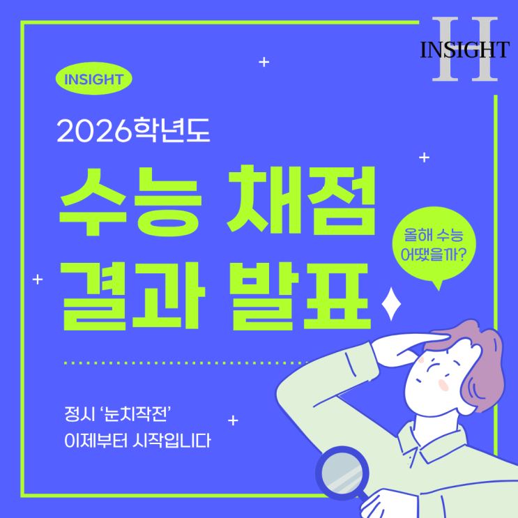 안녕하세요, 인사이트 학원입니다! 12월4일, 2026학년도 대학수학능력시험 채점 결과가 공식 발표되면서 수험생들은 본격적으로 정시 전략을 세우는 단계에 들어가게 됩니다. 오늘은 성적표(표준점수·백분위·등급)가 개별 배부되며, 이 성적을 기반으로 수시 최저 충족 여부와 정시 지원 가능 대학을 가늠할 수 있습니다. 1. 정시 일정 안내 올해 수능 지원생은 약 55만 명, 최근 7년 사이 가장 많은 규모입니다. 그만큼 정시에서도 경쟁이 치열할 것으로 예상됩니다. 2. 올해 수능, 어땠을까? 교육 당국은 수년째 킬러 문항 배제 기조를 유지하고 있지만, 올해도 주요 영역 난이도는 상승했다는 평가가 우세합니다. 3. 올해 입시의 최대 변수: &....... <img src="https://blogthumb.pstatic.net/MjAyNTEyMDVfNjAg/MDAxNzY0OTEzNjQwMTA1.OoFk0buiDVRaMJR2r9ZTC698iBUhrh63NkSfiCEXFjkg.RPYbi2gRhqWHVpthlSy9tgUUr6yoXTyLusMcCC7SkWYg.PNG/1.png?type=s3" />