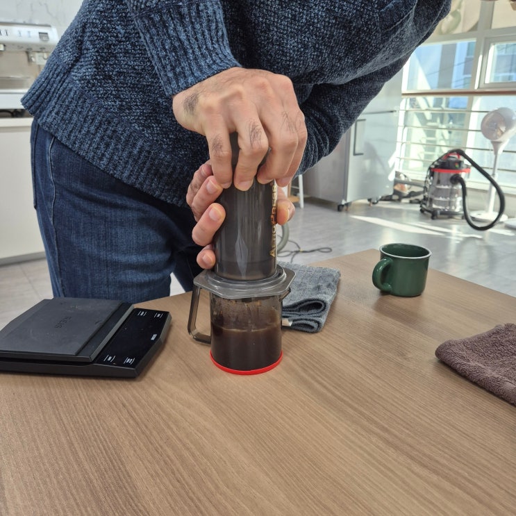 이번 브루잉 수업에서는 에어로프레스와 사이폰 두 가지 기구를 활용해 커피를 추출해보는 시간을 가졌어요. 두 방식 모두 장점이 뚜렷해서 수강생분들이 다양한 맛과 향을 비교해볼 수 있었고, 특히 사이폰 추출 과정에서는 강의실 분위기가 한층 더 up되었답니다^^ 에어로프레스(Aeropress) 작지만 다양한 맛을 끌어내는 기구예요 에어로프레스는 작고 간편한 기구이지만, 생각보다 깊은 맛을 낼 수 있어요. 압력을 이용해 커피를 추출하는 방식이라 추출 속도도 빠르고 휴대도 편해 여행용으로 많이 사랑받는 기구예요. 에어로프레스 특징은 아래와 같아요. 압력 추출과 침출 방식이 합쳐져 있어 맛의 변화가 뚜렷해요 추출 시간이 짧아 누구....... <img src="https://blogthumb.pstatic.net/MjAyNTEyMDhfMjYz/MDAxNzY1MTIyNzczODQy.in8_lcTZ65a02qkp2I9fNW7lRcdxO-JVDETJsePdq2Ag.k4SJ77_Q5juFcec284eyw7fCui3V5B0aNHlvSajW-XIg.JPEG/KakaoTalk_20251208_002901051.jpg?type=s3" />