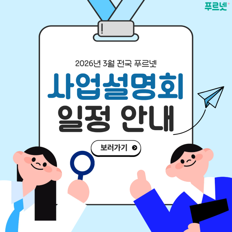 안녕하세요. 푸르넷입니다! “교육으로 미래를 바꿉니다” 21년 연속 학부모가 뽑은 교육브랜드 대상을 수상한 대한민국 대표 공부방 브랜드 <푸르넷>에서 교육으로 미래를 바꿀 예비 교육 전문가를 모집합니다! 2026년 3월 전국 푸르넷 사업설명회 일정을 확인해 보세요! 540만 명 이상의 회원이 푸르넷을 선택한 이유! 선생님들의 든든한 지원군 푸르넷 시스템! 시작부터 든든한 비교 불가 지원 혜택! 2026년 4월까지 신규/재계약 선생님들의 성공적인 정착을 위한 정착지원금 70만 원 지급! 푸르넷과 함께 미래를 바꿀 분야별 교육 전문가를 모집합니다! <모집 부문> 푸르넷은 누구에게나 열려있습니다! ✔️ 일과 육아를 병행하....... <img src="https://blogthumb.pstatic.net/MjAyNjAyMjZfOCAg/MDAxNzcyMDg0MDIwMjMx.nJ_dcnF36LWJqmQ9sU4ZNT0JFa3tHNGFQJTSK6oTwD0g.XZ7Y8MrGzo2YGTXVyEufcdObK2E4f1ttNLF7B6UiyCYg.PNG/1.png?type=s3" />