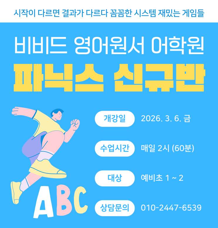 어느새 한 해가 저물어 가는 11월 입니다. 복대초 서현초 역시 학사 일정을 마무리해 갈 즈음인데요, 복대초 서현초 보내시는 부모님들께서 영어학원 알아보실 중요한 시기 입니다! 비비드 영어원서 어학원 역시 한 해를 잘 마무리 하는 동시에 새로운 신학기를 준비하고 있습니다. 11월 부터 2026년 신규반 모집을 시작하였구요, 현재 1/5 개강하는 신규반은 마감되었습니다. (정원 8명) 두번째 신규반 모집을 시작합니다. 2026년 3/6 개강 예정입니다. 대상은 예비초 1 ~ 2학년 친구들입니다. 너무나 감사하게도 대부분 소개를 통하여 입회하고 있습니다. 2026년 3월에 새롭게 만날 복대초 서현초 우리 친구들을 기대하고 기다리며 비비드의 첫....... <img src="https://blogthumb.pstatic.net/MjAyNTExMTRfMzUg/MDAxNzYzMTA5OTQ2ODc3.cUC_44Pwfosd3HTxA6IPTLjo82N6gvekiP4CPNf-1ncg.DzDJ2nvoUMHIZ13A4uKmhfb_ykCa3nAhXsF3yjrWfp8g.PNG/%C7%CF%B4%C3%BB%F6_%C8%F2%BB%F6_%B3%EB%B6%FB_%B7%AF%B4%D7%C5%A9%B7%E7%B8%F0%C1%FD_%C0%FC%B4%DC%C1%F6.png?type=s3" />