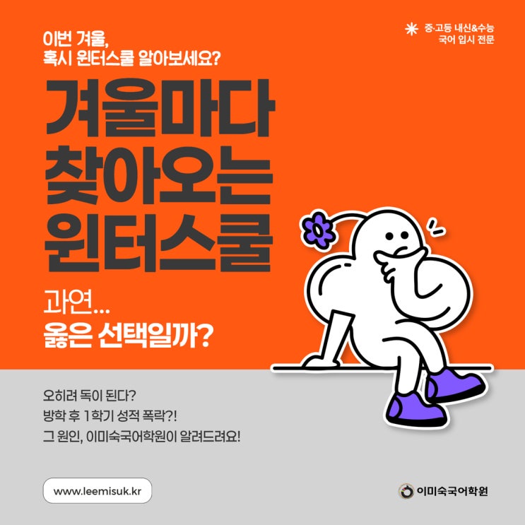 안녕하세요, 이미숙국어학원입니다. 겨울방학, 우리 아이의 성적을 비약적으로 올리기 위해 고강도 윈터스쿨 프로그램을 선택했던 학부모님들의 마음을 저희는 누구보다 잘 이해합니다. 하지만 방학이 끝난 후, 기대와는 달리 아이들의 1학기 국어 성적이 심각하게 하락하는 충격적인 결과를 마주하는 경우가 반복되고 있습니다. '귀한 방학 시간 투자했는데, 왜 성적은 오히려 떨어졌을까요?' '윈터스쿨에서 열심히 했는데, 실제 학교 내신에는 반영이 안된 걸까요?' '광범위한 윈터스쿨 커리보다 맞춤형 학습이 필요했던 걸까요?' '통제 학습에 익숙해져, 자기 주도 학습이 약해진 것 같아요..!' 왜 비....... <img src="https://blogthumb.pstatic.net/MjAyNTExMjlfOTMg/MDAxNzY0NDE3MDc2NjIw.9GLZmivhBPAVeL2v-OloFeRp6-C_G4vIXrdeWzyYeGMg.feH3Tk43n4YuvvaNsKEYBFP6tc073Iu8jRhpMJyRqHgg.JPEG/%C0%A9%C5%CD%BD%BA%C4%F0_1.jpg?type=s3" />