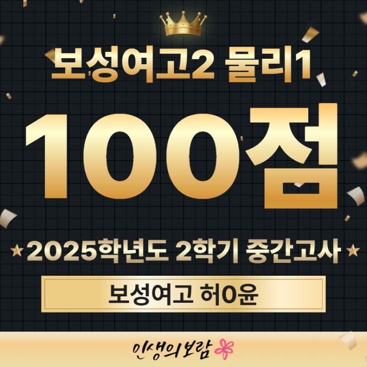 안녕하세요 인생의보람 수학과학 전문학원 본원입니다. 2학기 기말고사 잘 준비하고 계신가요?! 인생의보람 본원에서는 지금 한창 내신 대비 열기가 뜨겁습니다. 자연계 내신 전문 학원답게 이번에도 전교권 학생들을 확실히 만들어내기 위해서 모든 수업과 관리를 촘촘하게 진행되고 있는데요!! 오늘은 기말고사 의지를 북돋아줄 좋은 사례를 소개하려고 합니다. 지난 중간고사에서 당당히 전교 1등을 거머쥔 허0윤 학생입니다! 허0윤 학생은 수강생 30명 밖에 되지 않는 물리1에서 어떻게 전교 1등까지 올라설 수 있었을까요?? 인생의보람의 비결을 하나씩 살펴보면서, 기말고사 준비하는 여러분에게도 도움이 될 만한 팁들을 함께 나눠보려 합....... <img src="https://blogthumb.pstatic.net/MjAyNTEyMDdfMTky/MDAxNzY1MDc3NjA4NDE2.wGWhth7dBzpKUC06XNpgaIYB2v4sScaPPso2XIveET4g.PIMCmwvqUoJzw45A8_oer7zm0uED5lNg0xAsqX3Swjgg.JPEG/%C7%D0%BF%F8_%B3%BB%BD%C5_%BD%C7%C0%FB_%C5%DB%C7%C3%B8%B4_5_%281%29.jpg?type=s3" />