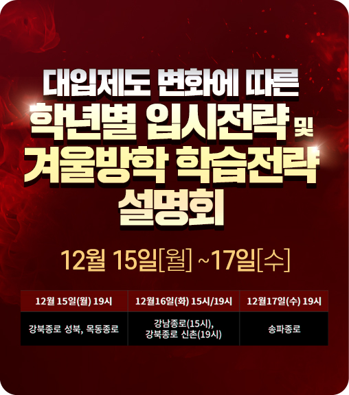 안녕하세요! 종로지기 입니다~! 대입제도 변화에 따른 학년별 입시전략 및 겨울방학 학습전략 설명회를 계최 합니다! =============================================================================== ■ 설명회 일시....... <img src="https://blogthumb.pstatic.net/MjAyNTEyMDlfMjM0/MDAxNzY1MjU0MzYxMzc4.totJ1mV9-9XCisEFHs_quxODdppqZnB4wrYyXc9DcKEg.6XPFr50PHn3pp3D44-oSOEkXvOc_6MCN8A4f6XxdR6Ig.JPEG/img251215exr.jpg?type=s3" />