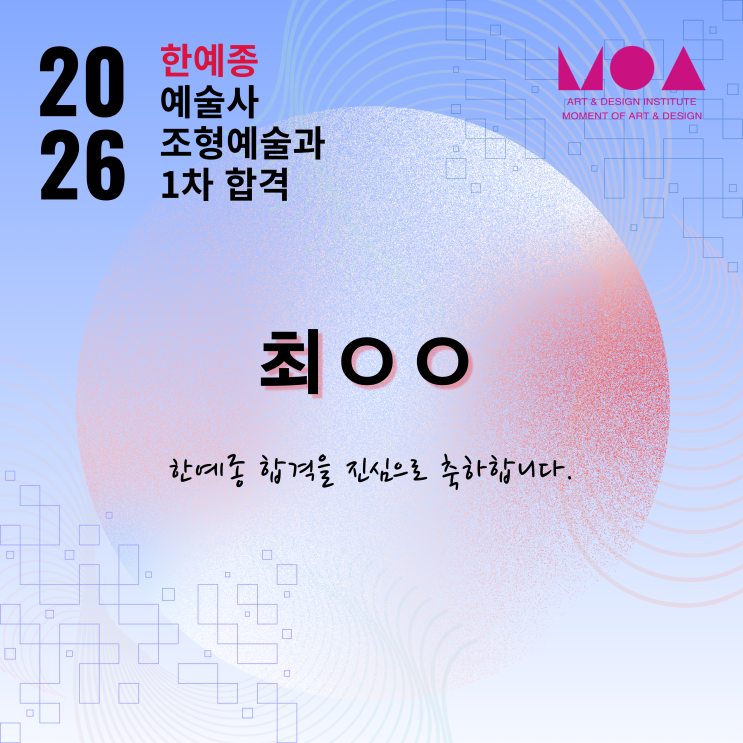 2026 한예종 예술사 조형예술과 1차 합격! ※합격을 축하합니다!※ ✨합격을 위한 체계적인 준비!✨ 전문적인 지도와 함께 당신의 예술적 가능성을 확장 하세요! 상담 문의 : 02 - 322 - 4979 / 010 - 2392 - 7680 카카오채널, 인스타DM, 블로그 상담실 문의 가능 <img src="https://blogthumb.pstatic.net/MjAyNTEyMDVfOTMg/MDAxNzY0OTEwMzk3NzMy.5GJm3WR8NN5KSkxLQf62HEFuzosxmW09sIoUVCWfpWog.5DBOjgVMhl2JrIVDVixmUe4ksfBv_3urwCtqMc7CgKMg.PNG/%C3%D600%C7%D1%BF%B9%C1%BE.png?type=s3" />