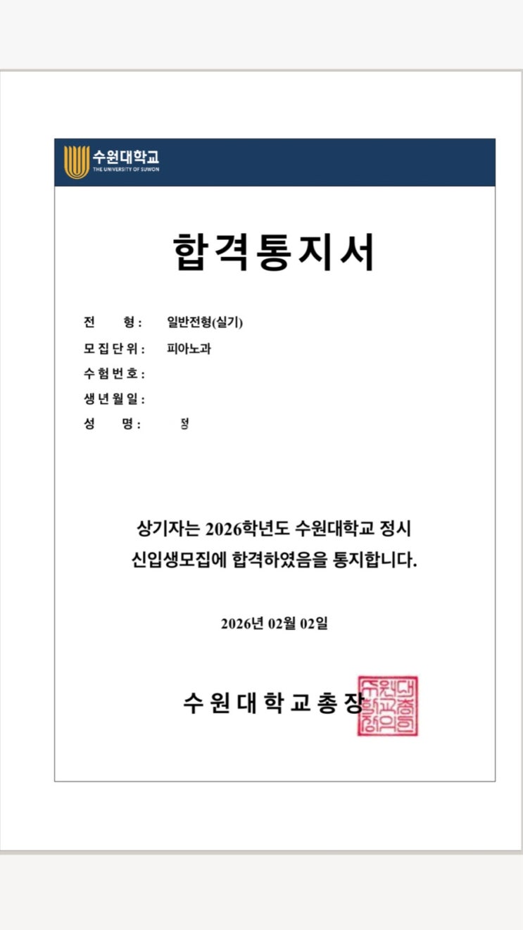 2026학년도 수원대학 피아노과에 학원생 *정*학생이 합격하였습니다~ 축하합니다. 원장프로필 레슨비안내 오시는길 #강서구피아노입시레슨 #예고피아노입시레슨 #음대피아노입시레슨 #양천구피아노전공레슨 #목동예중예고피아노입시레슨 #마곡피아노입시레슨 #오목교피아노전공레슨#초등피아노전공레슨#수원대피아노합격 <img src="https://blogthumb.pstatic.net/MjAyNjAyMDJfMTEw/MDAxNzcwMDM4OTY2NTcw.BUWzD8IjfwR4UjloB6I5qdG6ECoFu5KiZSRU5V_GP_Mg.UL0o_-CAFzrzUWID87gAvJEKI9HyAHthnZ6Kn24fvHkg.JPEG/IMG%A3%DF2048.JPG?type=s3" />