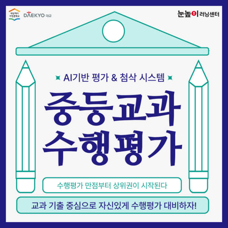안녕하세요, 대교 눈높이입니다! 중학교에 올라가면 학부모님들이 가장 많이 하시는 질문이 있습니다. “요즘 중학교는 시험만 잘 보면 되는 거 아닌가요?” 하지만 최근 중학교 내신에서는 수행평가의 비중이 40~60%까지 차지하고 있습니다. 즉, 시험 점수뿐만 아니라 수행평가 결과가 내신 등급을 좌우하게 됩니다. 그래서 요즘은 수행평가 준비가 곧 내신 준비라고 할 수 있습니다! 중학교 수행평가, 왜 중요할까요? 최근 2022 개정 교육과정에서는 수행평가의 비중이 더욱 확대되었습니다. 또한 평가 방식도 달라졌습니다. ✔ 단순 암기형 문제 감소 ✔ 생각을 정리하는 글쓰기 평가 증가 ✔ 논리적인 사고력 평가 확대 특히, 국어 과목에서....... <img src="https://blogthumb.pstatic.net/MjAyNjAzMTBfMTk5/MDAxNzczMTIzMjQ1NDQw.VQZfrvlrV9uZmzxZ4KuFyFiqg7Ve_0EaC-KqKhVQRcIg.MHuvzwJPGFPzpnzWCb6v4CTyqmMEveh1ZHzG5nooBaUg.PNG/1_LC.png?type=s3" />
