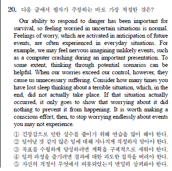 내신 대비 영어 내용 정리 ⭐ 주제 일어날 가능성이 낮은 미래 사건에 대해 지나치게 걱정하는 것은 불필요한 고통을 만든다. 1️⃣ 글 전체 흐름 이해 위험에 반응하는 능력(respond to danger)은 인간의 생존(survival)에 중요했다. 그래서 불확실한 상황(uncertain situations)에서 걱정을 느끼는 것(feeling worried)은 자연스럽다. 이러한 걱정은 미래 사건(future events)을 미리 예상할 때(in anticipation of) 자주 나타난다. 예를 들어 중요한 발표 중 컴퓨터가 고장 나는 것처럼 일어날 가능성이 낮은 사건(unlikely events)을 상상하며 불안해질 수 있다. 어느 정도는 가능한 상황들을 생각해 보는 것(thinking through pot....... <img src="https://blogthumb.pstatic.net/MjAyNjAzMTJfODUg/MDAxNzczMjcwMDA5OTIy.Gbs7imTbl0cdUU3oqnRdxLK1WoE_wK-apkZ-up-5_FAg.CWpQwg3pR5MKZoI5nNgEE_Sjwfgjoof3jX2qIbr9mK8g.PNG/image.png?type=s3" />