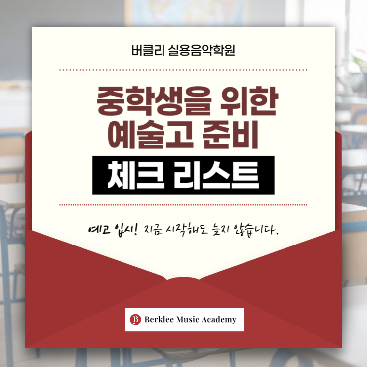 Play Your Dream, Sing Your Future! 안녕하세요. 마곡에 위치한 버클리실용음악학원입니다. 예고 진학을 고민하는 중학생이라면 지금 무엇을 준비해야 할지 막막할 수 있어요. 특히 실용음악 전공은 실기 실력 + 음악적 기초 + 포트폴리오 + 멘탈 관리까지 준비해야 할 게 많죠. 버클리실용음악학원에서 입시생들이 가장 많이 묻는 내용을 바탕으로 현실적인 체크리스트를 정리했습니다. 지금 준비하면 충분히 합격할 수 있어요! 전공 선택이 확실한가? 예고 지원의 첫 단계는 전공을 명확히 결정하는 것입니다. ▪️보컬 ▪️피아노/기타/베이스/드럼 등 기악 ▪️작곡/싱어송라이터 아직 확실하지 않다면? → 취미반 레슨으로 시작하여 수....... <img src="https://blogthumb.pstatic.net/MjAyNTEyMDhfOTkg/MDAxNzY1MTYyNDIzODc5.e2MMeZW11TsRY0CB9R0ROOkmnnzjADvvLuaEPaoVS0Ig.ICSTXO60eE9zgPyND3ptZTMVN5g0-HKeTwtpBJwC858g.PNG/%B8%B6%B0%EE_%BD%C7%BF%EB%C0%BD%BE%C7%C7%D0%BF%F8-002.png?type=s3" />