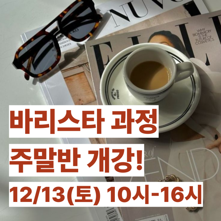 주말반 바리스타 자격증반 모집! 일주일에 한 번만 나오면 되는 초간단 스케줄! 바쁜 현대인들을 위한 주말 수업 이번주 토요일 오픈해요!☕ 과정: 바리스타 2급 자격증 속성과정 106차 날짜 :12월 13일~ 01월 10일 시간 : 토요일 오전 10시-16시 에스프레소·카푸치노·라떼아트까지 실기 위주로 진행되며, 총 5주만에 자격증 취득까지! 바쁜 직장인/학생도 무리 없이 가능! 내일배움카드 국비지원으로 최대 전액지원 가능! (일반 유형 자부담금 127,050원) “주말 하루 투자 = 바리스타 자격증 준비 끝!” 지금 바로 시작해보세요 ☕✨ --------------------------------------- 네이버 톡톡상담 바로가기 ▼▼▼ 카카오....... <img src="https://blogthumb.pstatic.net/MjAyNTEyMDlfMTk3/MDAxNzY1MjY0NDk3Mzc4.j6AaYM_GZ-druaVc_2vM_Th-GXEVW1HhuREhf2WlwxQg.H-eAtZVfRHc4Uw4L4crAsDR_ZOCrv6mHD_34iqWFV6wg.PNG/%C1%A6%B8%F1%C0%BB-%C0%D4%B7%C2%C7%D8%C1%D6%BC%BC%BF%E4_-001_%2899%29.png?type=s3" />