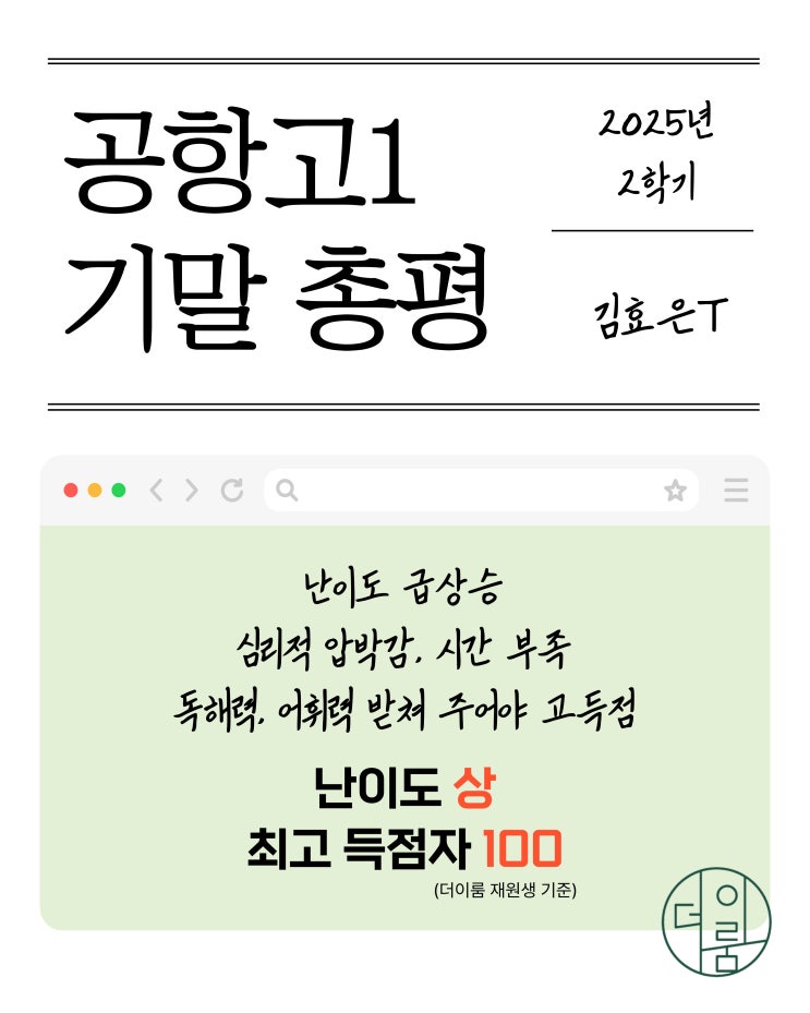 안녕하세요, 효은 쌤입니다. 오늘 공항고 1학년 학생들의, 1학년 마지막 국어 시험이 끝났습니다. :) 문법이 까다롭고 어려워서 시험 난이도가 상당히 올라갔는데.. 100점 받은 학생이 나와 놀라고 기뻤습니다. 세부 분석은 지금부터 보실까요? 저는 이제, 겨울학기를 알차게 보내기 위한 교재 연구하러 서점으로 갑니다! 우리 공항고 학생들이 남은 시험 잘 마무리하길 기도하며♡ 더, 이룸 학원 상담 문의 02-2665-3737 #한서고 #공항고 #방화동 #마곡동 #고등전문학원 #입시전문 #국어학원 #한서고국어내신 #한서고국어학원 #공항고국어내신 #공항고국어학원 #방화동국어학원 #마곡동국어학원 #방화동국어전문학원 #한서고수학 #한서고영어 #한....... <img src="https://blogthumb.pstatic.net/MjAyNTEyMTBfMTEg/MDAxNzY1MzQwNDM5OTA1.zF_qr1DZ00BgFqmEICtAC-3PWI4vAU2rkoa2cug_pm0g.6fG-WlS41oMhevffWo8OGhbFDAycD0Oa4Y30Mbu1vgsg.JPEG/001.jpg?type=s3" />