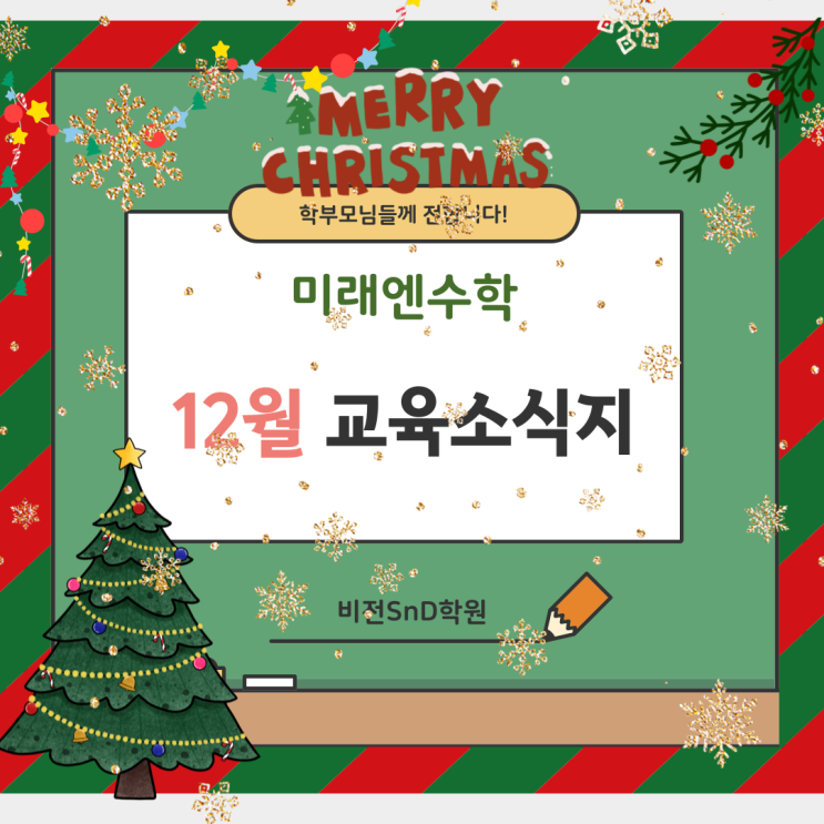 1:1 밀착 관리, 1등 수학 학습 시스템 미래엔수학 학부모님 안녕하세요! 수학 학습의 올바른 길을 제시하는 미래엔수학입니다 한 해의 마지막 달인 12월, 아이들의 노력과 성장이 차곡차곡 결실을 맺는 시기입니다. 미래엔 수학은 한 해의 학습을 체계적으로 정리하고, 학생별 성취와 부족한 부분을 세심하게 점검하여 다음 학년을 향한 확실한 발판을 마련하고 있습니다. 아울러 학생 개개인에게 꼭 필요한 맞춤 문제 제공, 성취도 분석, 자기주도학습 훈련을 통해 아이들이 자신감 있게 새로운 학년을 맞이할 수 있도록 책임감 있게 지도해 나가겠습니다. 감사합니다. 상담을 원하시는 학부모님께서는 언제든지 비전snd학원으로 문의주세요....... <img src="https://blogthumb.pstatic.net/MjAyNTExMjRfMTI5/MDAxNzYzOTc3MDI2MDIz.NWBxrmYhjY6BhCH7u1AtYCOsTq2MnCChjssDR-cgNt8g.N4QisKL-YhDZiVp0OajBlNd-774DRED3-gX-J6yhJGEg.PNG/%B1%B3%C0%B0%BC%D2%BD%C4%C1%F6-001_%281%29.png?type=s3" />