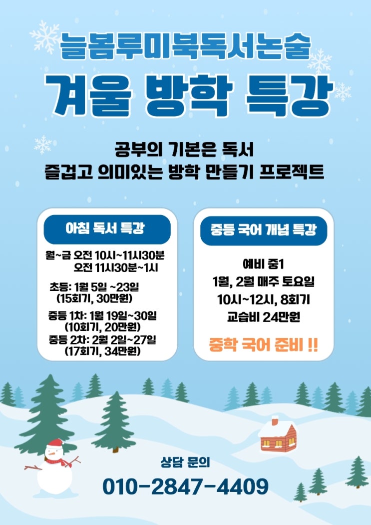 ❄️ 늘봄루미북독서논술 겨울방학 특강 안내 ❄️ 책으로 성장하는 겨울, 지금부터 시작해요! 안녕하세요, 늘봄루미북독서논술학원입니다 날씨는 추워지지만, 아이들의 성장은 멈추지 않죠! 많은 학부모님들이 이렇게 말씀하세요. > “방학 때만큼 아이가 몰라보게 성장하는 때가 없어요.” 맞습니다. 겨울방학은 아이들이 가장 크게 자라는 골든타임! 책을 읽고, 생각을 키우고, 글로 표현하는 힘을 기르는 시간입니다✨ 아침 독서 특강 월~금 10:00~11:30 또는 11:30~13:00 초등 독서반 1월 5일~23일 총 15회 / 30만원 중등 독서반 1차 1월 19일~30일 총 10회 / 20만원 중등 독서반 2차 2월 2일~27일 총 1....... <img src="https://blogthumb.pstatic.net/MjAyNTEyMDFfMiAg/MDAxNzY0NTcwODIwMDE1.Xjo8n3Mrr5taMAgsiNzYUtKhxs8rs2mQC_lj6BdJip4g.FQ3RVh4iD1Qc-mWUG1wfnJYQQKvnRV_krJypZZrYuEIg.JPEG/900%A3%DF%C7%CF%B4%C3%BB%F6_%B9%E8%B0%E6_%B4%AB%BF%C0%B4%C2_%BE%F0%B4%F6_%C7%B3%B0%E6_%BF%B5%BE%EE%C7%D0%BF%F8_%B0%DC%BF%EF%B9%E6%C7%D0_%C6%AF%B0%AD_%C0%FC%B4%DC%C1%F6%A3%DF20251130%A3%DF223540%A3%DF0000.jpg?type=s3" />