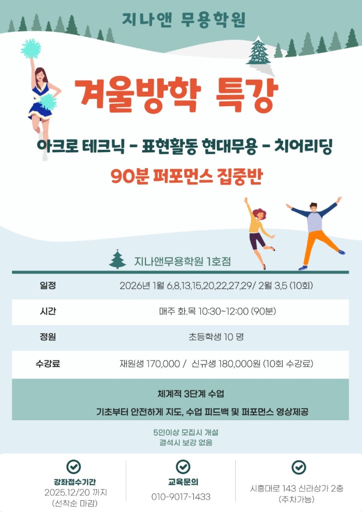❄️ 겨울방학 90분 퍼포먼스 집중반 – 지나앤무용학원 다가오는 겨울방학, 아이들의 무용 실력을 한 단계 업그레이드할 퍼포먼스 집중반을 진행합니다! 시흥동 무용학원인 지나앤무용학원 1호점에서, 전문 선생님 두 분이 함께 지도하며 아이들이 체계적이고 깊이 있는 무용 교육을 받을 수 있도록 구성했습니다. 수업 구성 아크로테크닉: 텀블링, 기초부터 응용까지 현대무용 표현활동: 창의적 신체 표현과 감각적 움직임 치어리딩: 에너지 넘치고 자신감 있는 안무 완성 수업 일정 요일: 화·목 시간: 오전 10:30 ~ 12:00 정원: 10명 (소수정예) 수강료 재원생: 17만원 신규생: 18만원 제공 혜택 랠리즈 앱을 통해 매회 수....... <img src="https://blogthumb.pstatic.net/MjAyNTExMjVfMjQ3/MDAxNzY0MDM3MzcxMzM4.IcdletBbhyqKcvZjgY__WSq82NDdCDh14lWWU8Cx6AAg.i-QK14HP0acnqVEpPwVPV4HEMCT_tDgPaIwbBnxD0K8g.JPEG/900%A3%DF1764033084297.jpg?type=s3" />