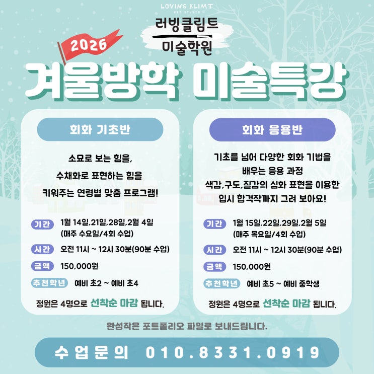 안녕하세요! 러빙클림트 미술학원 입니다 2025년 한 해 동안 우리 친구들이 그려낸 그림들은 색깔도, 선도, 마음도 모두 한층 더 깊어지고 반짝였어요. 올해 보여준 상상력과 노력에 큰 박수를 보냅니다. ✨ 이번 겨울도 재미있게 배우고, 꾸준히 성장하는 멋진 시간이 되길 바라며 2026 겨울 방학 미술 특강 을 소개합니다! 회화 기초반 ✏️ 1. 소묘(Drawing) 기초부터 탄탄하게! 회화기초반에서는 그림의 가장 중요한 기본기인 소묘를 먼저 익혀요. 초등학생들이 어렵지 않게 따라올 수 있도록 기본 명암 단계부터 천천히 지도합니다. 소묘는 모든 그림의 ‘뼈대’가 되기 때문에 아이들의 표현력·관찰력·집중력을 한꺼번에 키워줍니....... <img src="https://blogthumb.pstatic.net/MjAyNTExMzBfNDMg/MDAxNzY0NDgzNzg0ODM0.hAF9ypLNkznVgs24WVNc33z3cvcR6J7v6VexYe8TI4cg.dkoAESqYFlT0fPV7Wy8aMEMytU7Bejv-sTV-Aln0ImEg.JPEG/2026_%B0%DC%BF%EF%B9%E6%C7%D0_%C6%AF%B0%AD_%C0%CE%BD%BA%C5%B8.jpg?type=s3" />