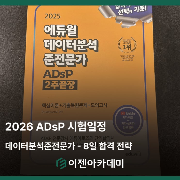 2026년 ADsP 자격증 데이터분석준전문가 시험일정이 공개되자마자 많은 분들이 자연스럽게 달력을 다시 보게 됩니다. 시험 일정은 이미 정해져 있는데 준비는 아직 시작하지 못한 상태라 마음이 급해지기 때문입니다. 교재를 사서 펼쳐보면 두께부터 부담스럽고, 어디서부터 어떻게 시작해야 할지 막막해지는 경우가 대부분입니다. 특히 데이터 분석이라는 영역 자체가 비전공자에게는 낯설게 느껴지기 때문에 시작조차 미루게 되는 경우도 많습니다. 2026년에는 ADsP 시험이 총 네 차례 시행됩니다. 2월 7일, 5월 17일, 8월 8일, 10월 31일로 일정이 이미 확정되어 있습니다. 문제는 시험 횟수보다 원서접수 기간입니다. 접수 기간이 생각보다 매....... <img src="https://blogthumb.pstatic.net/MjAyNjAxMTNfODcg/MDAxNzY4Mjg1MDkxMTc2.Ht7f2sO-OPmnCBGGxsdmGlx32Jl_i1nkti8uoLPf88sg.gMpP78gkD9_f0ljRDzY1w8HU04x9qqJdYFZ5mPiM6RQg.JPEG/%C0%CC%C1%A8%BE%C6%C4%AB%B5%A5%B9%CC_%BD%E6%B3%D7%C0%CF_%BA%B9%BB%E7.jpg?type=s3" />