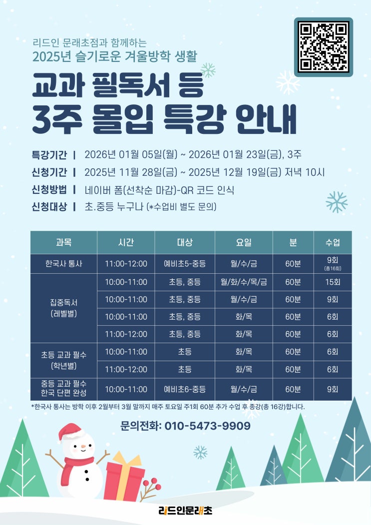 리드인 문래초점과 함께하는 슬기로운 겨울방학 생활 '한국사, 교과 필독서' 등 3주 몰입 특강 2025 겨울방학 특강! 꼭 들어야 하는 이유는 무엇일까요? 겨울방학은 한 학년을 마무리하고 새 학년을 준비하는 시간입니다. 1. 학습 공백을 막을 절호의 기회 긴 겨울방학에는 학습 리듬이 깨지기 쉬운데요. 방학 특강을 통해 학습 흐름을 유지하면서 평소 부족했던 독서 활동을 보충하고, 어휘, 사실, 추론, 비판의 모든 영역에서 부족한 부분을 채워 빈틈없이 문해력을 키울 수 있습니다. 2. 미리 준비하는 새 학기 한국사 특강, 교과 필독서(초등/중등) 특강에서는 새 학기에 배울 내용이나 주제를 미리 공부할 수 있습니다. 새 학....... <img src="https://blogthumb.pstatic.net/MjAyNTExMjhfMTQ1/MDAxNzY0MzAyMjMyMTQ0.LfkMHgOMNa7ELsAUo1qcKvL6vqCaFEm8avu__WLw80cg.9TOm5pL64eH02iFIm-P3cEXSIQV-8kQr4iGjVZ8bP0wg.JPEG/2025_%B0%DC%BF%EF%B9%E6%C7%D0_%C6%AF%B0%AD_1128%BA%CE%C5%CD.jpg?type=s3" />