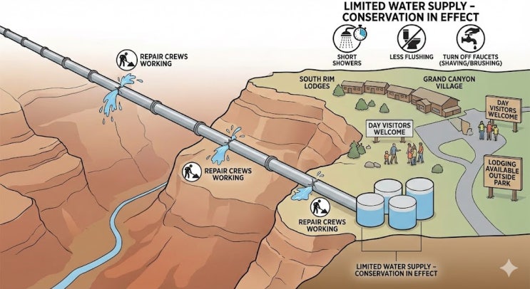 Overnight stays at the Grand Canyon's South Rim lodges have been canceled because of water-line breaks. There is only one water line to the South Rim, and crews are working on multiple breaks to that line. The failures have prompted strict conservation measures to preserve limited resources. For park staff and the 2,500 who live year-round in Grand Canyon Village, it means short showers, less toilet flushing, and turning off faucets while shaving or brushing teeth. Day visitors are still welcome at the South Rim, and there is lodging available outside the park. I'm Ed Donahue. 1️⃣....... <img src="https://blogthumb.pstatic.net/MjAyNTEyMDlfMTkx/MDAxNzY1MjQ4MTczOTI1.KpM_mQYNCnQDefHjT0VJ99WrOAKgC_OO4BUbH9d8SNUg.OqmrM4y92rrTaViGXs6k6rbna-iWEmcFaxz9t6Vanr4g.JPEG/unnamed_%2836%29.jpg?type=s3" />