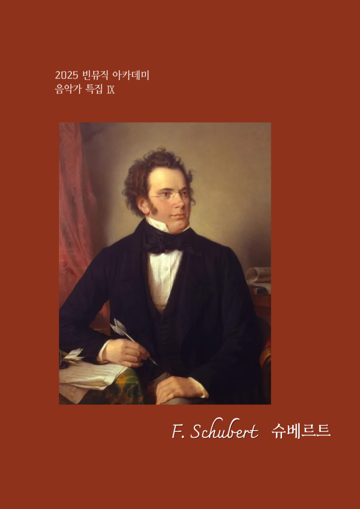 ♬ 안녕하세요. 빈뮤직입니다. 음악가 특집Ⅸ에서는 낭만주의 음악가 중 한명인 슈베르트(R. schubert)에 대해 알아보겠습니다. 프란츠 페터 슈베르트(Franz Peter Schubert, 1797–1828)오스트리아 빈 출신의 낭만주의 초기 음악가로, 짧은 생애(31세)에도 불구하고 600곡 이상의 가곡(Lieder)과 다양한 기악·관현악 작품을 남긴 작곡가입니다. 특히 서정성과 감수성, 풍부한 하모니, 자연스러운 선율미로 낭만주의 음악 발전에 결정적인 영향을 끼쳤습니다. 1. 생애 개요 ■ 어린 시절 - 1797년 빈 근교 리히텐탈에서 학교 교사 집안의 12남매 중 네 번째로 태어남. - 가족 내 음악적 분위기 속에서 자연스럽게 음악 교육을 받음. - 뛰어....... <img src="https://blogthumb.pstatic.net/MjAyNTEyMDlfMjEy/MDAxNzY1MjQyOTMwNjcz.HOo-tIlhK0RTpddZ3wGpu1zEZxZV655plumPnRfrFgYg.P1MOOUqtWX6vWvqqIylOhKHosmFsctti9raEEP2lPm0g.PNG/%C1%A6%B8%F1%C0%BB_%C0%D4%B7%C2%C7%D8%C1%D6%BC%BC%BF%E4._%2811%29.png?type=s3" />