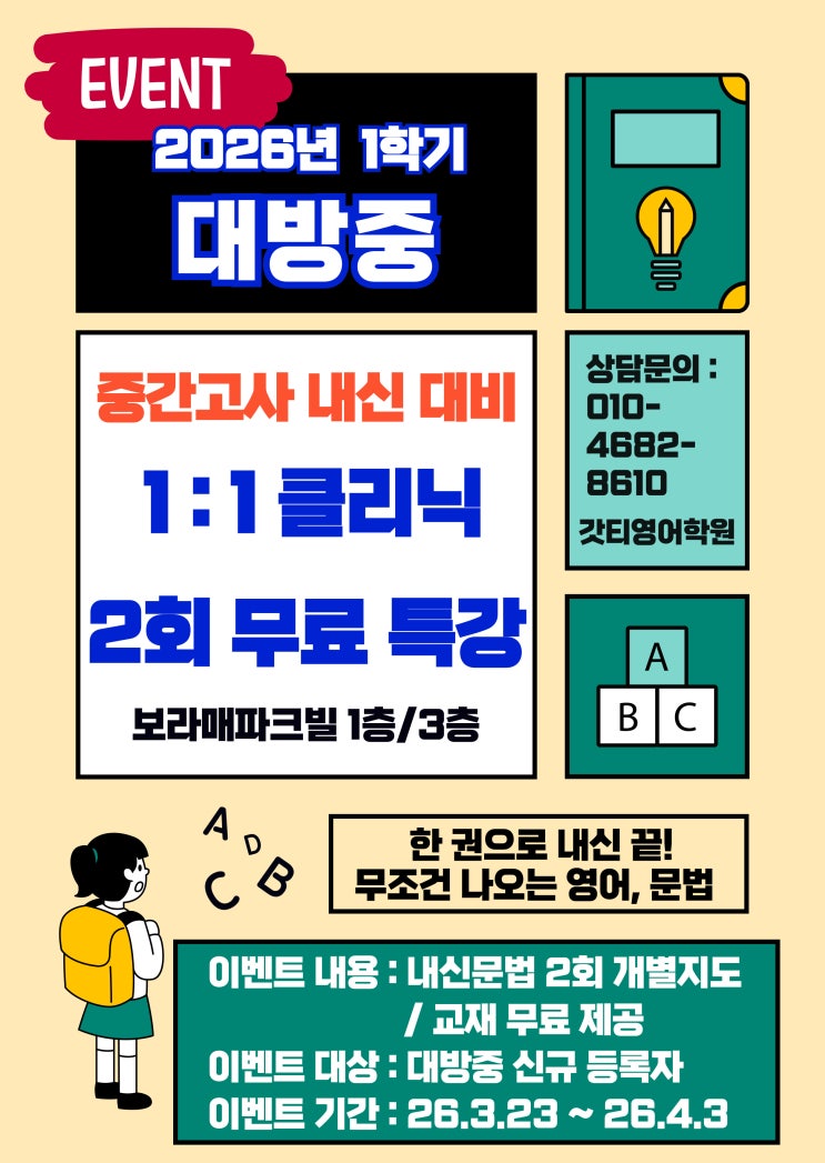 [신대방동 영어] 대방중학교 주목! 2026년 1학기 중간고사 '영어 내신' 완벽 대비 1:1 클리닉 & 무료 특강 안내