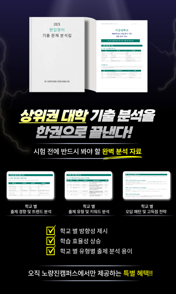 안녕하세요 용산 강남 영등포 마포 양천 관악 구로 서초 광명 종합반 김영편입 노량진캠퍼스입니다. 편입 성공의 당락을 결정짓는 마지막 관문은 결국 '기출 분석'입니다. 하지만 단순히 문제만 푸는 것으로는 부족합니다. 각 대학이 선호하는 출제 경향과 오답 패턴을 완벽히 꿰뚫어야만 실전에서 승리할 수 있습니다. 오직 노량진캠퍼스를 등록하는 신규생들을 위해 저희 캠퍼스에서 자체 제작한 2025 편입영어 기출 문제 분석집을 공개합니다! 이 분석집, 무엇이 다른가요? 이미지 속 내용을 통해 확인하실 수 있는 이번 분석집의 핵심 포인트 3가지를 소개합니다. 1. 학교별 출제 경향 및 트렌드 분석 최근 3~5개년 데이터를 바탕....... <img src="https://blogthumb.pstatic.net/MjAyNjAzMjZfMjg4/MDAxNzc0NTA4MjQ4OTU3.c_KR1Jhwg5ZEDE-B8aVZKbShINFseBIz6yg-WrS1ybUg.KJkMgLA7Kht8v11cy3MiJoCb9dQsTjlLUyPVbc0Hv88g.PNG/%B1%E2%C3%E2%BA%D0%BC%AE.png?type=s3" />