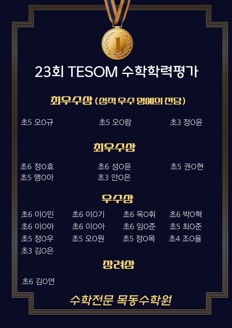 안녕하세요~ 목동수학원 보스원장 심우승 입니다. 요즘 아이들의 쾌적한 학습 활동을 위해 소소한 학원 단장으로 시간가는줄 모르고 있습니다. 이제 기말고사가 마무리 되면 아이들이 자연스레 학원에서의 학습시간이 길어지기에 조금씩 더 신경쓰며 단장하고 있습니다. 한동안 아이들을 괴롭히던 독감은 이제 조금 주춤해 진것 같습니다. 그래도 아직 본격적인 추위는 시작된게 아니니 아이들 건강관리에 힘써주시길 바랍니다. 저 역시 학원 위생에 더욱 많은 신경을 쓰겠습니다. 오늘은 지난 11월15일에 실시된 25학년도 하반기 TESOM 수학학력평가 결과가 발표되어 지난 28일에 모든 학부모님들께 문자와 카톡을 통해 전달해 드렸습니다. 이번....... <img src="https://blogthumb.pstatic.net/MjAyNTEyMDJfMTIy/MDAxNzY0NjgyNDMwMjM4.Qx_7HLLe5i4loLmFIxGAr10mAgwN-b8Z2Gk9rpmkg1gg.FWdE1tq1kmeYa96oxwMyhqSrT01VB9alEgK--_nxj1Yg.PNG/%C1%A6%B8%F1%C0%BB-%C0%D4%B7%C2%C7%D8%C1%D6%BC%BC%BF%E4_-001_%281%29.png?type=s3" />
