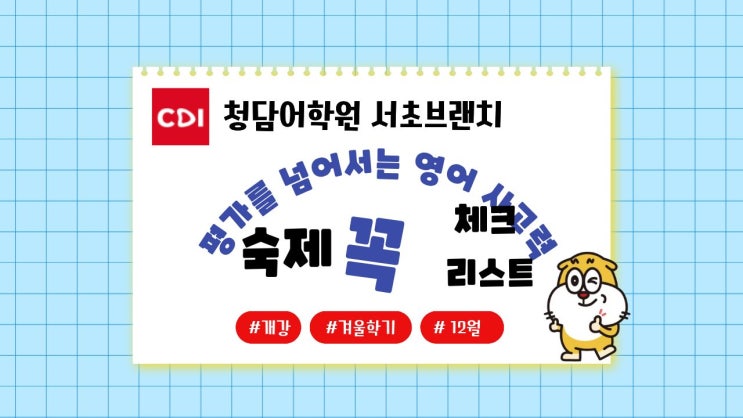 안녕하세요, 청담어학원 서초 브랜치입니다! 차가운 겨울바람 속에서도 우리 학생들과의 따뜻한 배움은 계속됩니다. 겨울학기, 드디어 개강했습니다! ⛄✨ 새로운 학기를 힘차게 시작할 수 있도록 1~5주차 과제(HW Check List) 를 안내드립니다. ✏️ HW Check List 활용 방법 각 주차별 과제와 학습 범위를 확인하실 수 있어요. 출력하여 집에서 체크하며 활용하시면 더욱 효과적입니다! 1️⃣초등학교 3~4학년 수업안내 A2 수업: 매주 월·화요일 "득점력 강화" 수업 -단어 Spelling Test 진행 V1 수업: 매주 목·금요일 "원서ㆍ프로젝트" 수업 -단어 Retest 진행 2️⃣초등학교 5학년 이상 수업안내 A2 수업....... <img src="https://blogthumb.pstatic.net/MjAyNTExMjRfMTE1/MDAxNzYzOTgyMjY2MDE1.k6UyKLT9ZI5wWh9QIRMA0eN3yrl4NllT9exXLWrBfdAg.JeyU4PrpN4T6WiukEOZMpXSH5ofab8_SH5iU7uTBQdsg.JPEG/%C1%A6%B8%F1%C0%BB_%C0%D4%B7%C2%C7%D8%C1%D6%BC%BC%BF%E4.jpg?type=s3" />