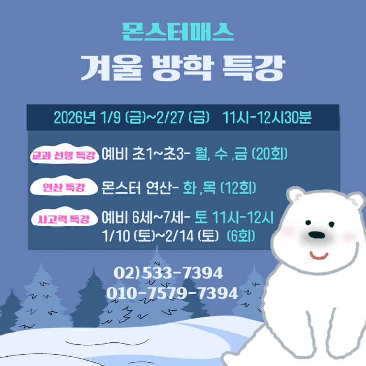 신학기를 앞두고 너무나~~소중하고 중요한 겨울 방학!! 겨울 방학동안 실력도 재미도 모두 모두 앞서 나가 보아요~~ 두달의 기적!! 몬스터매스로 오세요.^^ <img src="https://blogthumb.pstatic.net/MjAyNTEyMDlfNjAg/MDAxNzY1MjY4OTExNDMz.pYtf-Fb3udOVzn1HGxAdqZuhCRZyx93ChQSYDzI1Cwkg.paWpoLr7rcF-majq3OO99a40PjOBeQCfNgtBsiDynFIg.PNG/%B3%B2%BB%F6_%B9%E8%B0%E6%C0%C7_%B0%DC%BF%EF_%B4%C0%B3%A6%C0%C7_%C7%D0%BF%F8_%B0%AD%C0%C7_%BC%F6%BE%F7_%C1%A4%BA%B8_%C0%CE%BD%BA%C5%B8%B1%D7%B7%A5_%C6%F7%BD%BA%C6%AE.png?type=s3" />