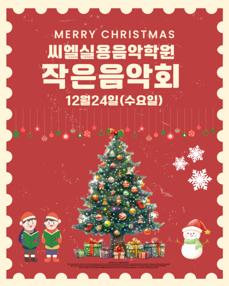 Merry Christmas!! 크리스마스가 내일모레네요 이번에는 감계 초등학교 아이들의 방학이 짧아서 학업에 열중하다 보면은 긴긴 겨울이 될 거 같아요. 잘 지내셨죠. 이번에도 씨엘에서는 음악회를 준비하였습니다. 씨엘이 속해있는 "감계 푸르지오 아파트 상가 학원들과 연합하는 행사"로 푸리단길 이벤트와 함께 진행이 되는 음악회 입니다. 학원들이 모두 참여 하여 각각 학원에서 작은 행사를 하고 학원행사를 참여한 학원생들에게 선물을 나눠주는 행사에 우리 학원은 원생들과 푸리단길 친구들을 위한 음악회를 준비하였습니다. 씨엘의 음악회는 피아노만 연주하는 것이 아니라 드럼과 베이스 기타 선생님과 합주로 연주를 하게 됩....... <img src="https://blogthumb.pstatic.net/MjAyNTEyMjNfMTYw/MDAxNzY2NDY1Mzk5Mjk2.EVnS42cJSrdVzCwRUpveAJMHIoRL6qRJqLHlozaEM90g.I5uSEOtIGe-AZMcTATzm276FYvdlSOU-0MM1RcYszu0g.PNG/900%A3%DF1766465383544.png?type=s3" />