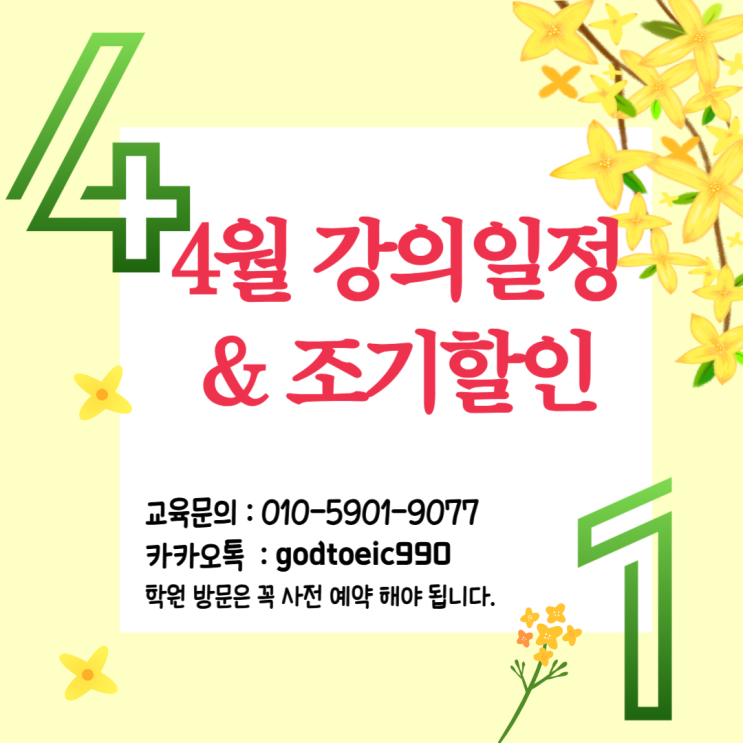 [마산, 창원 토익 학원] 4월 강의 일정&조기 할인_현강&실라방&당일 수업 영상 무제한 다시 보기_아직 토익 공부 늦지 않았다!!