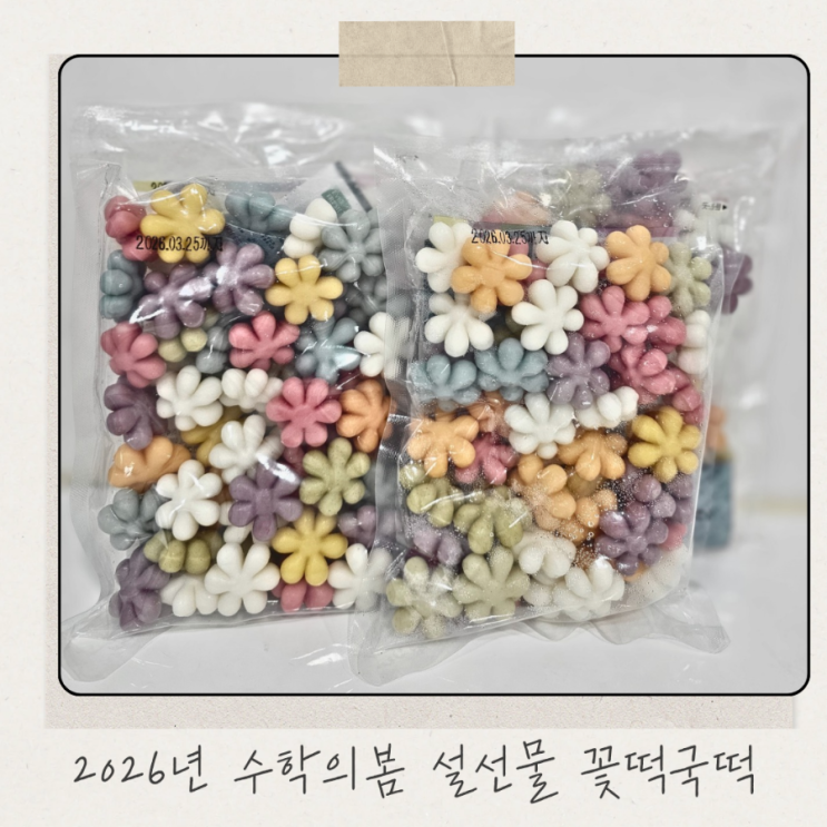 2026년 수학의봄 설선물 너무 예쁜 꽃떡국떡 안녕하세요 마산수학 수봄쌤입니다. 저는 매년 명절에는 수학의봄 학부모님께 드릴 작은 선물을 준비합니다. 5년을 넘게 꾸준히 아이들 맡겨주시는 학부모님이 너무나도 감사하고 또 감사하기만 해요. 벌써 6년째 선물을 하다보니 매번 고민이 되더라구요. 조기, 복조리, 오란다, 강정, 오색떡국떡, 쌀 등등 많이 했는데 이번 2026년에는 너무 예쁜 꽃떡국떡을 발견하고는 딱이다 싶어 바로 주문을 했어요. 저와 같이 설선물 고민하는 분들 계실까봐 소개해 드리고 싶은 마음에 블로그에 기록 남겨 봅니다. 꽃 떡국떡은 만능 천하무적 워킹맘이 만들어서 믿고 먹을 수 있다는 슬로건을 걸고 판매를 해....... <img src="https://blogthumb.pstatic.net/MjAyNjAyMTFfMjAy/MDAxNzcwNzc3MjgwNjg3.QmRQJh-pn8OCng8ZpKntLq_bjdpDsa9HqGu9unMvKSEg.T-hr9wSy_WDoIAaM3BlPjR8thT_Rt0OPYfYb-cvJEBUg.PNG/900%A3%DF%BA%A3%C0%CC%C1%F6_%BD%C9%C7%C3%C7%D1_%C8%DE%B0%A1_%BE%C8%B3%BB_%B0%F8%C1%F6_%C0%CE%BD%BA%C5%B8%B1%D7%B7%A5_%C7%C7%B5%E5%A3%DF20260211%A3%DF113212%A3%DF0000.png?type=s3" />