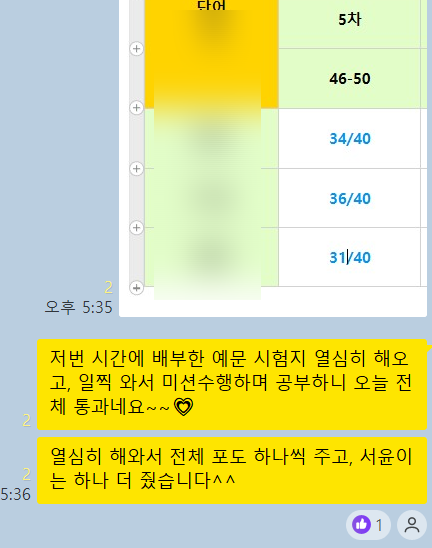 안녕하세요, 이룸영어 김채은 T입니다 :) 요즘 날씨가 훅 추워지면서 정말 겨울이 온 게 실감나네요. 오늘은 “김채은 T의 실시간 꼼꼼 피드백 시스템” 을 소개해보려고 해요! 저희 이룸영어 초등부 수업은 단어시험 → 문법 → 독해 순서로 진행되는데, 아이들이 시험을 보거나 문제를 풀 때마다 맞힌 개수와 틀린 포인트를 바로 표로 정리해요. 그리고 수업이 끝나면 그 데이터를 학부모 단톡방에 실시간으로 공유해드립니다. 학부모님들은 오늘 어떤 범위를 배웠는지, 어떤 개념이 강조되었는지, 우리 아이가 진도를 얼마나 잘 따라가고 있는지 한눈에 확인하실 수 있어요. 내 아이 학습 흐름이 투명하게 보이는 거죠! 또 수업 중 아이들이 자....... <img src="https://blogthumb.pstatic.net/MjAyNTExMjhfMjIg/MDAxNzY0MzE2NTU1MjA5.H6YM5killZaKRp4X-TouXaXEQ7zDTJVevjhyLq2x8Sog.vVp4j7IIqVlWS1yfnTbzxTmvXPBhgqRXaiV9pKmWFngg.PNG/KakaoTalk_20251128_165008905.png?type=s3" />
