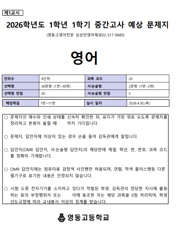 26년 1학기 1차 고사 고등부 내신 시간표