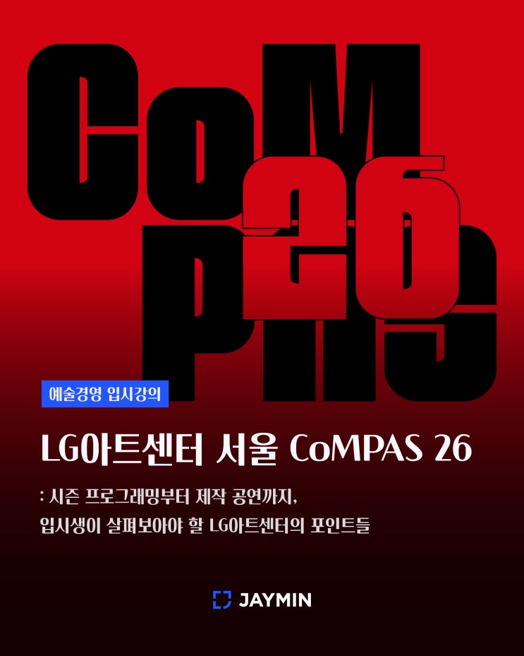 [예술경영 입시강의] LG아트센터 서울 CoMPAS 26 : 시즌 프로그래밍부터 제작 공연까지. 입시생들이 살펴보아야 할 LG아트센터의 포인트들 CoMPAS란 무엇인가? Contemporary Music and Performing Arts Season 이라는 뜻의 LG아트센터의 정체성을 담은 기획공연 시즌제. 세계 공연예술계를 이끄는 거장들, 새로운 흐름을 만드는 주목할 만한 신예 예술가들, 세계 무대로 진출할 잠재력을 가진 국내 아티스트들의 무대를 소개한다. CoMPAS 26 주요 라인업 현실을 압도하는 새로운 세계관의 등장 올해 라인업 중 가장 눈에 띄는 작품들은 현실과 환상이 교차하는 독창적인 세계관을 담은 해외 연극/무용 공연이다. 자신만의 독보적인 무용 언어를 구....... <img src="https://blogthumb.pstatic.net/MjAyNjAxMTRfMjY4/MDAxNzY4Mzc4NjIyMzgy.beL6DKaLX7C0T4pieLfVK-bmwxAUAi3oNncthx5-S0wg.BA976dBW6hjRY81vGi9cyQwPqPwfwlKAgcIVNKfiJt0g.JPEG/%C1%A6%C0%CC%B9%CE%C4%AB%B5%E5%B4%BA%BD%BA_LG%BE%C6%C6%AE%BC%BE%C5%CD_CoMPAS26_1.jpg?type=s3" />