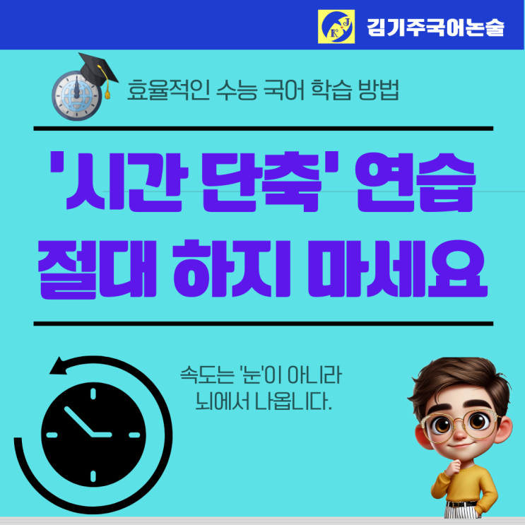 안녕하세요. 수험생들의 멘토, 수능 국어의 본질을 꿰뚫는 목동국어학원의 중심 '김기주 국어(주클래스)'입니다. 2026년 1월, 매서운 한파만큼이나 우리 예비고3 학생들과 학부모님들의 마음도 무겁게 느껴지는 시기입니다. 겨울방학이 시작되고 본격적인 수험 생활에 돌입하면서, 학원에서 상담을 진행하다 보면 열에 아홉은 이 질문을 하십니다. "선생님, 아이가 지문 읽는 속도가 너무 느려요." "모의고사를 보면 항상 마지막 지문은 찍고 나옵니다. 타이머 맞추고 빨리 푸는 연습을 시켜야 할까요?" 학부모님, 그리고 학생 여러분. 결론부터 단호하게 말씀드립니다. 이번 겨울방학에 '시간 단축' 연....... <img src="https://blogthumb.pstatic.net/MjAyNjAxMTVfODAg/MDAxNzY4NDM0NDI2NzM3.t5FL_pmXNL6oEslxAQTViOepvWYB1buRBGUTOqU0jLIg.cMlKpPja1DdLkSOhfza8TrrlXdDxqNkoc-P7qucU_SMg.PNG/%C6%C4%B6%F5%BB%F6%B0%FA_%C8%B8%BB%F6_%BD%C9%C7%C3%C7%CF%B0%ED_%B1%F2%B2%FB%C7%D1_%BA%F1%C1%EE%B4%CF%BD%BA_%C4%AB%B5%E5%B4%BA%BD%BA_%C0%DB%BC%BA_%BF%E4%B7%C9_%BE%C8%B3%BB_%B5%F0%C0%DA%C0%CE_%C5%DB%C7%C3%B8%B4_%C0%CE%BD%BA%C5%B8%B1%D7%B7%A5_%C6%F7%BD%BA%C6%AE%C0%C7_%BB%E7%BA%BB_%2843%29.png?type=s3" />