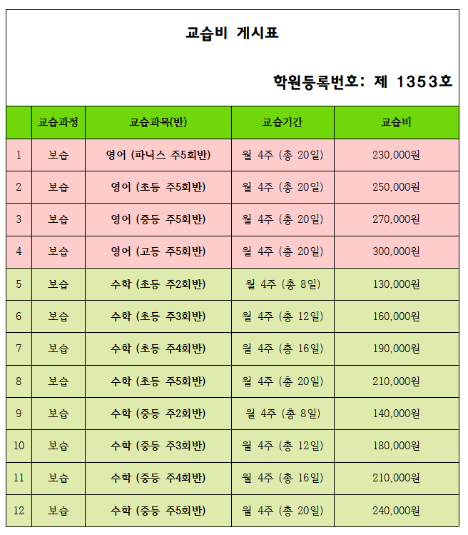 26년도 교습비 변경