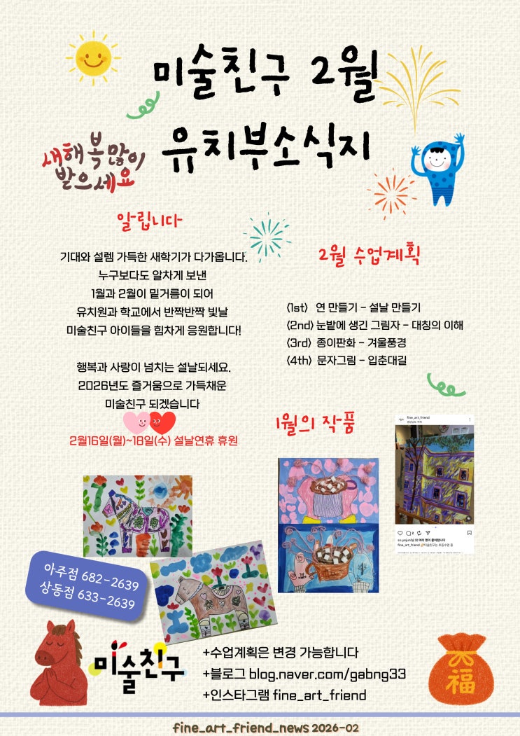 2026년 2월 유치부 소식지 2026년 2월 초등부 소식지 #용소초미술#내곡초미술#상동초미술#용산초미술#아주초미술#거제시초등미술#거제아동미술#미술친구학원 #거제초등미술#아주동미술학원#상동초미술학원 <img src="https://blogthumb.pstatic.net/MjAyNjAxMjZfNTcg/MDAxNzY5NDA1ODYyMDIz.BKvp8uaScl8Vqq5oHuiV4Uue_5kmcqaFXp3dZ6YNUUwg.kT1vWZINQaDQp-xff8NMuHcUSELQRlPasJVy8eZZ86Yg.JPEG/2%BF%F9_%C0%AF%C4%A1%BA%CE_%BC%D2%BD%C4%C1%F6.jpg?type=s3" />