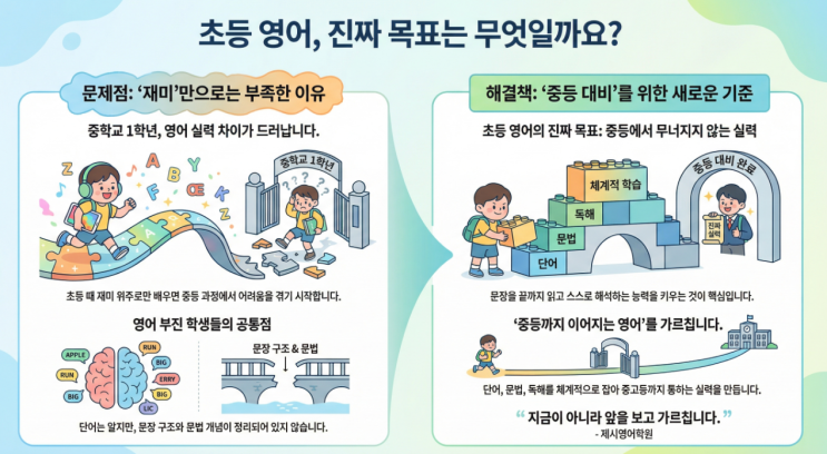 초등 영어, 언제부터 ‘중등 대비’를 해야 할까요? 초등 영어 상담을 하다 보면 가장 많이 듣는 말이 있습니다. “아직 초등인데, 너무 이른 거 아닌가요?” “일단 재미있게만 해도 되지 않을까요?” 맞는 말입니다. 초등 저학년 때는 영어에 대한 거부감 없이 즐겁게 시작하는 것도 분명 중요합니다. 하지만 초등 고학년이 되면 영어의 성격은 조금 달라집니다. 초등 고학년부터, 영어는 ‘실력 차이’가 드러납니다 중1 첫 시험에서 영어 점수로 힘들어하는 아이들을 보면 대부분 공통점이 있습니다. 단어는 어느 정도 외웠지만 문장의 구조를 정확히 이해하지 못하고 문법 개념이 머릿속에 정리되어 있지 않은 경우 이런 아이들은 초등 때 영....... <img src="https://blogthumb.pstatic.net/MjAyNjAxMjlfMTQw/MDAxNzY5Njk1MDI0NDY5.SXkJqcump8s8aJLUZncrKxeGkRqaezhh6Zh8cs3_Yykg.IZP4rFmoK-Ghr348VVsUP5mor1On8yFg2LSq1xXdYw8g.PNG/image.png?type=s3" />