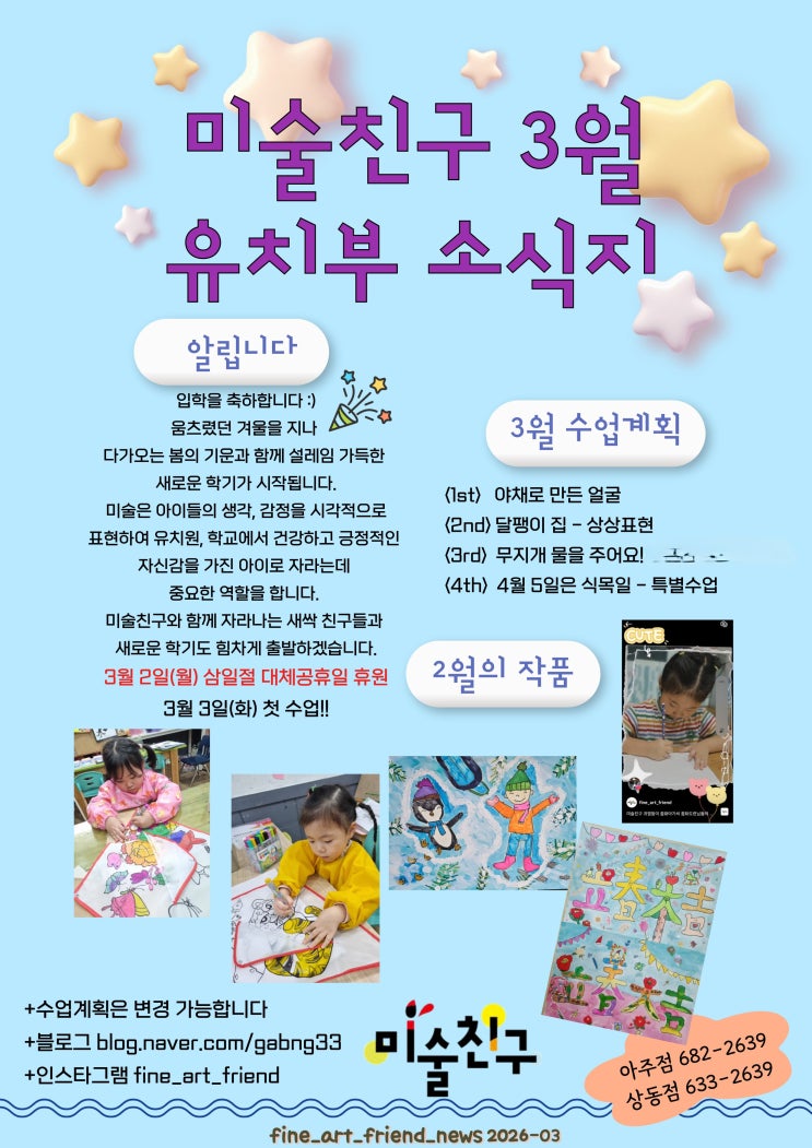 3월 유치부소식지 3월 초등부 소식지 #거제미술친구, #미술친구아주동, #미술친구상동점, #미술친구학원초등부, #거제유치원, #거제초등미술학원, #아주동미술학원, #상동미술학원#아주초미술학원#내곡초미술학원#용소초미술학원#상동초미술학원#용산초미술학원 <img src="https://blogthumb.pstatic.net/MjAyNjAzMjZfMTUz/MDAxNzc0NTE4NjY0NDEx._ZmA0Ynu9-C1vS0UhtYFlLyii_J0Ffbi2GjnSVIeG0Mg.LAk9a2ZokOAwbgCnKbXFOuz6hXFc8tJn_CwkUb0x2tcg.JPEG/3%BF%F9_%C0%AF%C4%A1%BA%CE%BC%D2%BD%C4%C1%F62.jpg?type=s3" />