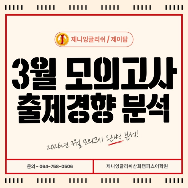 안녕하세요. 제니원장입니다. ⭐️ 지난 화요일에는 고등학생들의 모의고사가 있었습니다. 3월 모의고사는 올 해 입시의 추이를 예상할 수있기에 빠르게 분석후 부모님들께 정보를 공유해드립니다. 전반적으로 3-4문제를 사고력 문제로 직독직해만이 아닌 비유적표현에 대한 추론과 논리적인 흐름 문제를 변별력 있는 문제로 냈습니다. 철학적 사고를 요하는 지문이 오답율이 가장 높았습니다. ✅ 초등단계에서는 스토리북, 원서를 통해 다양한 지문을 접하며 배경지식을 넓혀 나가는 것이 목표가 되어야 할 것입니다. ✅ 중등은 문법적인 기본기와 어휘력을 신장시켜야 하는 단계로서 단순히 문법을 이해하는 것에서 나아가 반드시 복습노트....... <img src="https://blogthumb.pstatic.net/MjAyNjAzMjdfMTY5/MDAxNzc0NTU3MzgwNzIw.TIdBuZm3ftDDWVHCbT1d3UZtpHdXmW29bAo1PJgp2Ewg.9E_BnvlqoeAMr21fS7irQ8ISAOHdElknXYPrh_BB_Jog.JPEG/IMG%A3%DF0200.jpg?type=s3" />