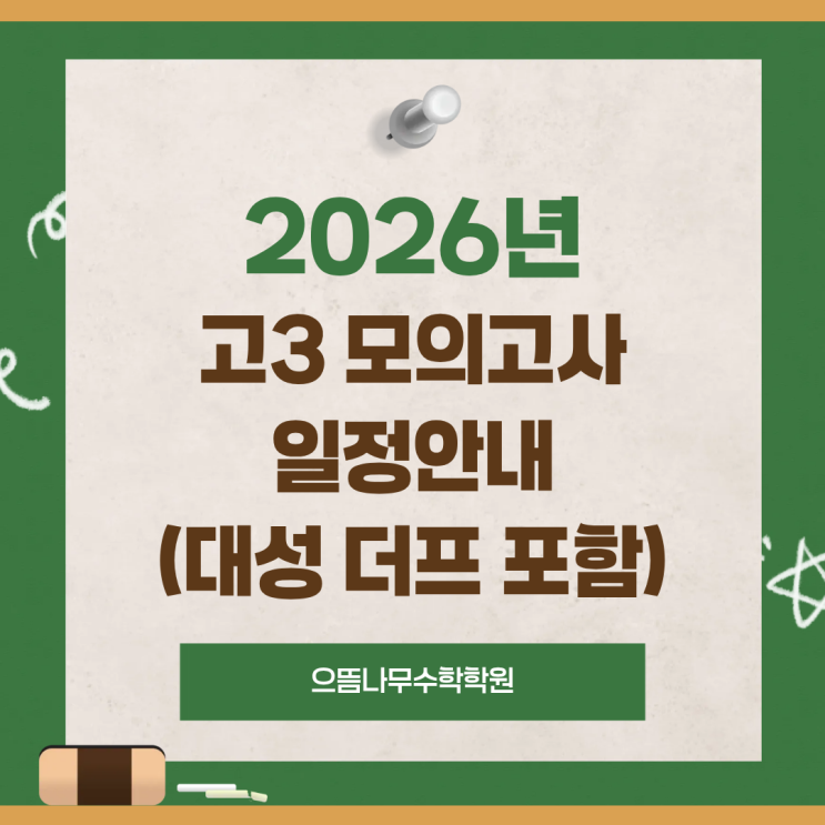 안녕하세요 으뜸나무수학학원입니다. 2026년 고3 학생들 모의고사 일정을 안내해드리려 합니다. 교육청모의고사를 비롯하여 학원에서 실시하는 대성 더프리미엄 모의고사일정까지 정리되어있으니 참고부탁드립니다. 저희학원은 매달 대성 더프리미엄 모의고사를 통해 학생들이 실전 감각을 꾸준히 익힐 수 있도록 지도하고 있습니다. 모의고사를 정기적으로 치르는 이유는 단순히 시험 횟수를 늘리기 위해서가 아니라, 실제 수능과 유사한 환경을 반복경험하며 시간 관리 능력, 집중력, 긴장 조절 능력을 자연스럽게 훈련하기 위해서입니다. 실전은 낯설수록 흔들리기 쉽지만, 익숙해질수록 안정적으로 자신의 실력을 발휘할 수 있습니다. 반복된....... <img src="https://blogthumb.pstatic.net/MjAyNjAzMjZfMTEz/MDAxNzc0NTM2MzEzODkz.St_x4tJSVV8H4f5PNvZxeJlO1h7dfBldora7DCacZPwg.kIMcKXRhvJTECkWeGZ3i-4QeiDSy1k3QZ6FNGr8jrdUg.PNG/%C1%A6%B8%F1%C0%BB_%C0%D4%B7%C2%C7%D8%C1%D6%BC%BC%BF%E4..png?type=s3" />