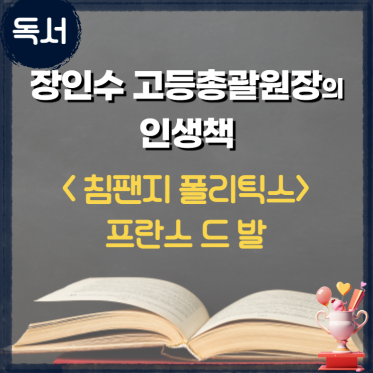 위드피플 과사람 장인수 고등총괄원장 장인수 고등총괄원장의 인생책, 조직의 관계를 읽는 책, 《침팬지 폴리틱스》 장인수 고등총괄이사님의 인생책은 프란스 드 발의 《침팬치 폴리틱스》입니다. 관계를 지향하는 조직에서, 늘 중요한 건 “누가 옳은가”보다 “어떻게 함께 가는가”죠. 이 책은 침팬치 사회를 통해 인간의 본성을 통찰하게 해주고, 그 통찰이 조직에서 원만한 이해관계를 형성하고 모두가 이해하는 방식으로 발전적인 단계로 나아가는 과정을 보게 해준다고 합니다. 이런 분께 추천해요 조직/팀의 관계가 어렵게 느껴질 때 갈등을 ‘감정’이 아니라 ‘구조’로 보고 싶은 분 <오늘의 한 문장> “관계는 선의만으로 굴....... <img src="https://blogthumb.pstatic.net/MjAyNjAzMzBfMTc3/MDAxNzc0ODU1MzQ2Mzcx.1Crl3_zhQiEflgCawJhjznmC8ypjJt7JSc9C054odKAg.eiad-dA5N6D90uA_O10Qrs8gWlfXgl0RLU1ZJyq0XJ0g.PNG/%B5%B5%BC%AD%C3%DF%C3%B5_%C0%CE%BB%FD%C3%A5-003.png?type=s3" />