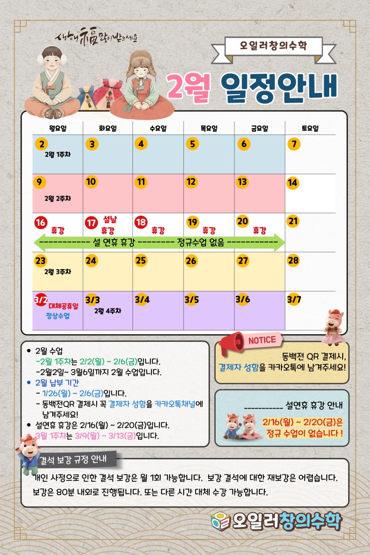 병오년 새해 복 많이 받으세요! 2월 설 연휴에는 16일(월)~20일(금) 휴강입니다. 2월 수업은 다음과 같이 4주 동안 진행됩니다. 1주차 : 2월2일~6일 2주차 : 2월9일~13일 설 연휴 휴강 : 16일(월)~20일(금) 휴강 3주차 : 2월23일~27일 4주차 : 3월2일~6일 2월 수강료 납부 기간입니다. 1월 26일 ~ 2월 6일 동백전QR 결제시, 결제 후 꼭 카톡을 남겨주세요!! 결제자 성함과 학생의 이름이 달라 확인 안될 수 있습니다!! 오일러창의수학학원 : 대연동 몬스터매스 문의 : 051-625-7788 위치 : 마로니에타운 5층(블루샥, 파리바게트 건물 5층) <img src="https://blogthumb.pstatic.net/MjAyNjAxMjZfNDUg/MDAxNzY5Mzk0MTk2OTc4.N9bPf4wWJZybBSlR4fAM1iH1nMo6da90EC64_HiFumcg.jdO5j8JJILYTnJDa9CeLGCaMt2rzhSNabJ_VCTvEATog.JPEG/%BC%D2%BD%C4%C1%F626%B3%E2_2%BF%F9.jpg?type=s3" />