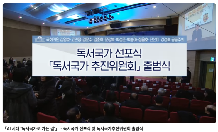 독서국가 선포식 및 독서국가 추진위원회 출범 1. 행사 개요 및 비전 일시/장소: 1월 23일, 국회의원회관 대회의실 주요 메시지: "읽는 인간만이 AI를 주도한다", "독서는 선택이 아니라 국가 생존 전략이다" 목표: 독서를 개인의 취미를 넘어 국가 차원의 정책과 사회 시스템으로 격상 2. 학교급별 독서 교육 추진 체계 (생애 주기별 맞춤형) AI 시대 인재 양성을 위해 유아부터 고등까지 독서 교육의 구조적 변화를 꾀합니다. "독서는 구호가 아니라 실천"이라는 기치 아래, 구체적인 교육 현장의 변화도 예고되었습니다. (✅️현장 이야기: 이미 우리는 다 실행 중인걸요? 라는 목소리도 많습니다. 독서국가 선....... <img src="https://blogthumb.pstatic.net/MjAyNjAxMjhfMTAw/MDAxNzY5NTg5ODc5NzI1.t5T72Ui47dUqC4wnQybUTPHTpR3PR1U2ZlD2tCyEkW0g.b4QLkpq-PB-EusUyzqOt4noA-JfZZNDN2Naon0M-NJgg.PNG/image.png?type=s3" />