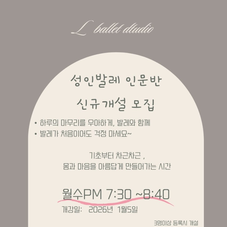 ✨ 성인 발레 인문자반 신규모집 ✨ 하루의 끝, 나를 더 아름답게 바꾸는 시간 요즘 많은 유명 셀럽들도 바디라인 관리와 힐링을 위해 ‘발레’를 선택하죠✨ 우아하게, 천천히, 나만의 속도로 시작해보세요. 처음이어도 괜찮아요. 기초부터 차근차근— 몸과 마음이 달라지는 경험을 함께할게요 월·수 PM 7:30 ~ 8:40 2026년 1월 5일 개강 3인 이상 등록 시 개설됩니다. #엘발레스튜디오#명지발레#신평발레#하단발레#다대포발레#명지국제신도시발레#명지초등발레#명지유아발레#명지성인발레#신평성인발레#신평발레핏#하단성인발레#괴정발레#괴정성인발레#명지발레학원#명지토요발레#명지발레핏 <img src="https://blogthumb.pstatic.net/MjAyNTEyMDRfMTYz/MDAxNzY0ODMwMjE1MDY2.CnZAWd_wGvbP7GyT5B4SNDE8iP0NWaFdevJp5nXu-j8g.QbvF5DRN0SipWkUfA2p-0NRGa44oH2ZZyRKs5W8wYOwg.JPEG/IMG%A3%DF4741.jpg?type=s3" />