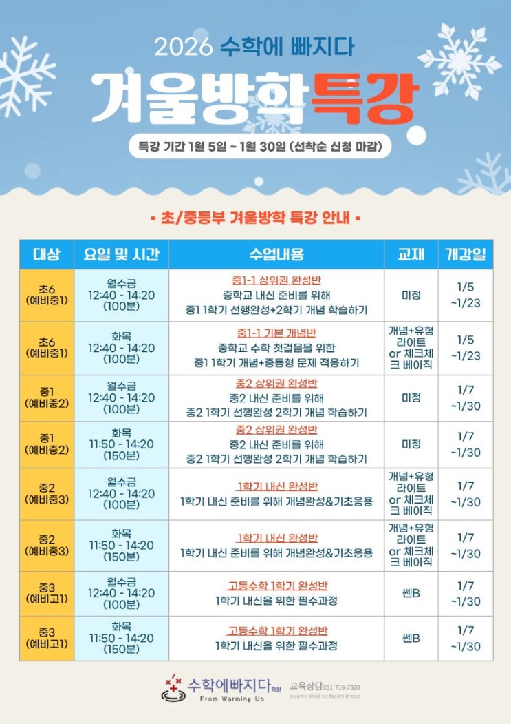 안녕하세요. '수학에 빠지다' 입니다. 다가오는 겨울방학을 맞아 학생들의 현재 학습 상태를 점검하고 다음 학기를 준비하기 위한 겨울방학 수학 특강을 준비하고 있습니다. 겨울방학은 수학 학습에 가장 중요한 시기입니다. 학기 중에는 진도를 따라가느라 놓쳤던 부분들이 그대로 쌓이고 이 상태로 새 학기를 시작하면 '열심히 하는데 성적이 오르지 않는' 상황이 반복되기 쉽습니다. 방학특강이 아니더라도 꼭 방학 동안 수학에 시간을 투자해서 점검하고 복습/예습하는 시간을 가지시길 바랍니다. 본 특강은 √재원생 우선 모집으로 진행되며 √재원생 신청현황에 따라 정원이 마감되거나 √신청 인원이 충족되지 않을 경....... <img src="https://blogthumb.pstatic.net/MjAyNTEyMThfMTA4/MDAxNzY2MDY1Mjc2MjQz.Us6-qnnfqRDLp8L8nTscZ_e-TEXx85gKFJUP1ZRC89Eg.qSFbD7_2wEL8W5A3T217QB8YdBvJ8KLx9Ss_XwdUgkog.JPEG/1.jpg?type=s3" />