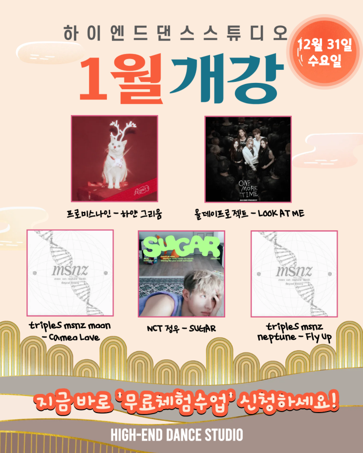 안녕하세요! 모두가 주인공이 되는 공간 명지댄스학원 하이엔드댄스스튜디오 입니다:) 이제 2025년이 정말 얼마 남지 않았는데요! 2026년 붉은 말의 해가 다가오고 있습니다!! 여러분들은 2025년 행복한 한 해 보내셨나요~?? 저흰 하이엔드 친구들과 함께해 너무 행복했답니다 앞으로도 쭉 하이엔드 친구들과 행복할 예정..✨ 오늘 저희가 준비한 소식은 하이엔드 1월 개강일 안내 및 수업곡 소개입니다 과연 1월엔 어떤 최신/핫한 KPOP수업곡을 배울지 1월 개강일은 언제인지 함께 알아볼까요!? 하이엔드댄스스튜디오 1월 개강일 - 12/31(수) 월수/월수금 개강 - 1/2(금) 금 개강 - 1/3(토) 토 개강 - 1/6(화) 화 개강 각 정규....... <img src="https://blogthumb.pstatic.net/MjAyNTEyMjZfMTE2/MDAxNzY2NzI5MDgzNDgz.VcWPVSLKV5d4OMJMASjkk6gMd7YEYEQMiDwiKK8EBJIg.MR7cXD4qAmCCveviH1sBdNsNHTglAvS1rjPs-R04r_og.PNG/%C1%A6%B8%F1%C0%BB_%C0%D4%B7%C2%C7%D8%C1%D6%BC%BC%BF%E4._%281%29.png?type=s3" />