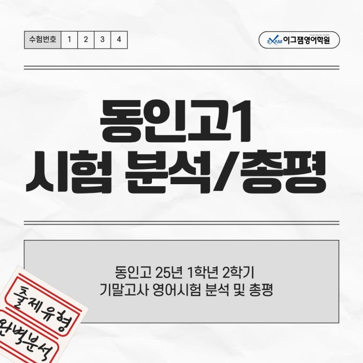 안녕하세요! 사직이그잼영어학원입니다~ 어느덧 2025년도 막바지에 접어들며, 중·고등학교 2학기 기말고사도 모두 마무리되었습니다. 이번 2025학년도 2학기 동인고 1학년 영어 기말고사는 교과서 이해를 기본으로 하되, 모의고사 지문을 적극 활용해 사고력과 서술형 실력을 동시에 평가한 시험이었습니다. 단순히 본문을 외운 학생보다, 지문의 구조를 이해하고 문법을 정확하게 적용할 수 있는 학생에게 유리한 출제 경향이 뚜렷했습니다. 그렇다면 이번 시험은 어떤 방향으로 출제되었고, 어디에서 변별력이 갈렸을까요? 지금부터 25학년도 2학기 동인고 1학년 영어 기말고사 총평지를 바탕으로, 시험의 핵심 포인트를 함께 살펴보겠습니다! ....... <img src="https://blogthumb.pstatic.net/MjAyNTEyMzBfMjUg/MDAxNzY3MDU5MDc2OTE5.Ps7F0COZRCBH8hjms_6zirhuiJXBG2a64dIG89IhZnog.WX5zlZgvNp0fZUnmFqMEV5q014icXD2KNLBpdWNREi0g.JPEG/%C3%D1%C6%F2%BA%D0%BC%AE_-_%BD%E6%B3%D7%C0%CF.jpg?type=s3" />